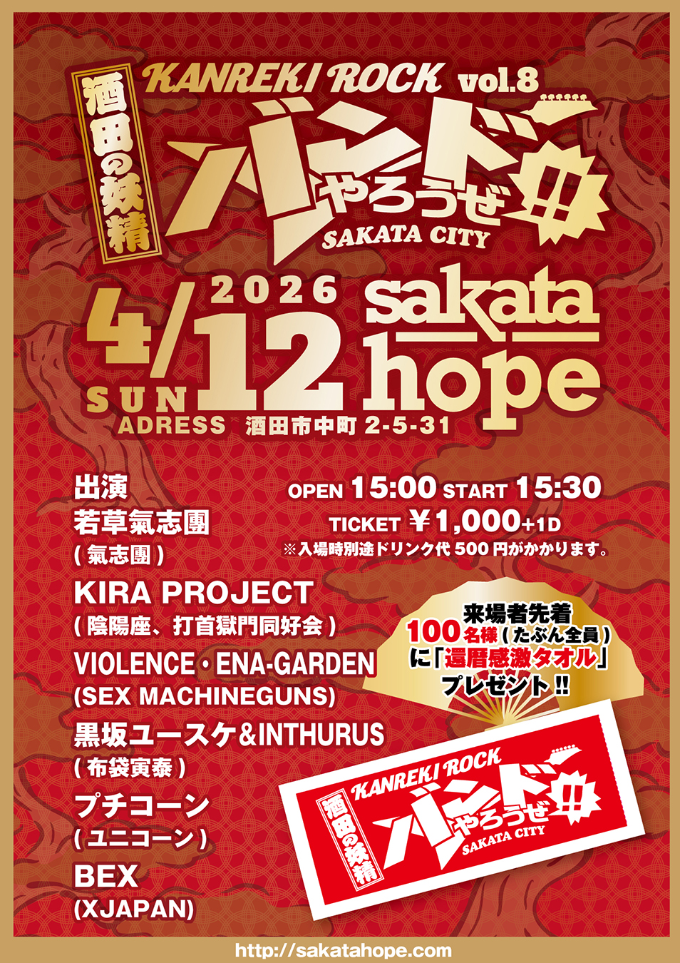 open 15:00 start 15:30 ticket 1,000yen+1D 来場者先着100名(たぶん全員)還暦感激タオルプレゼント‼